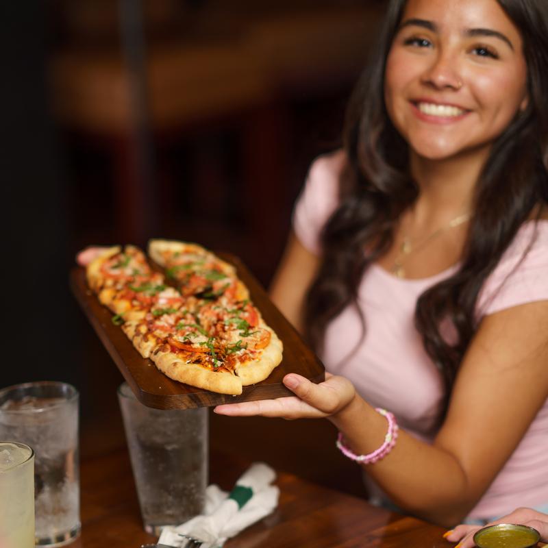 A crispy flatbread topped with marinara sauce, tomatoes, fresh mozzarella, and fragrant basil, finished with a drizzle of balsamic glaze - light, bright, and perfect for sharing. $12