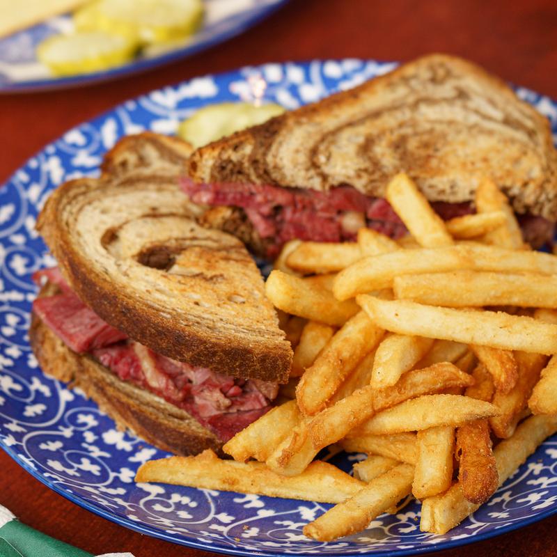 Tender corned beef with homemade sauerkraut, Swiss cheese & thousand island dressing, and pickles on marble rye bread. $16